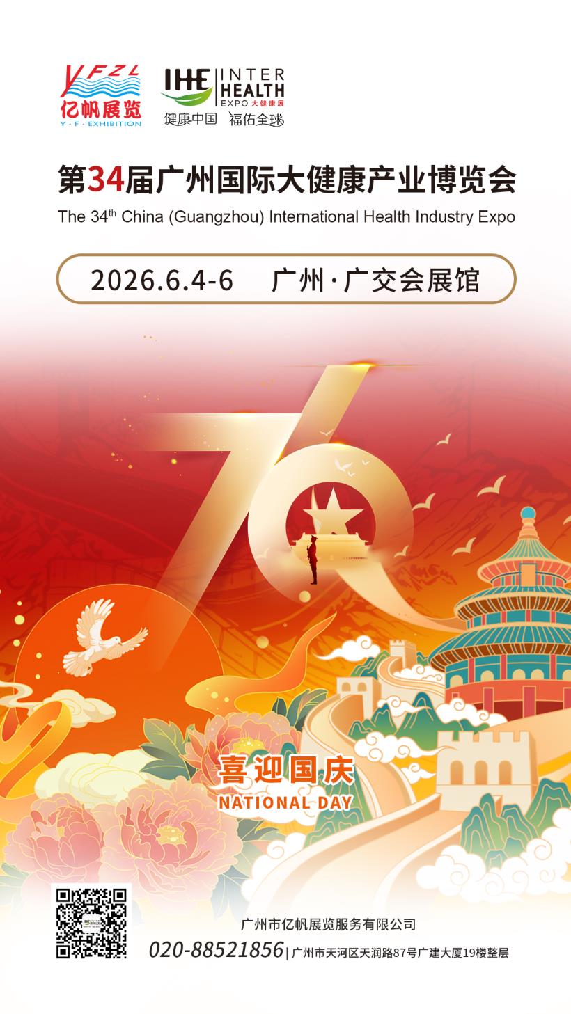 IHE China IHE第34屆廣州國際大健康產業博覽會將于2026年6月4-6日在廣州?廣交會展館舉行,大健康博覽會由廣州市億帆展覽服務有限公司主辦,是國內首個提出“大健康博覽會”概念。大健康展會已連續成功舉辦到第34屆,已成為亞太地區頗具規模的大健康博覽會,2023年榮獲廣州市商務局頒發“成功舉辦18年”獎牌!。